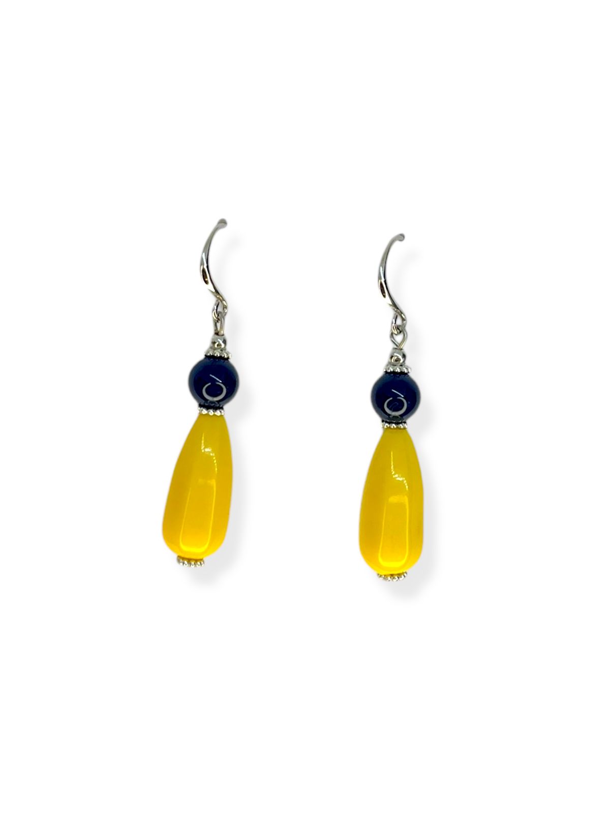 Brinco anzol niquel com bola azul marinho de resina e gota amarela