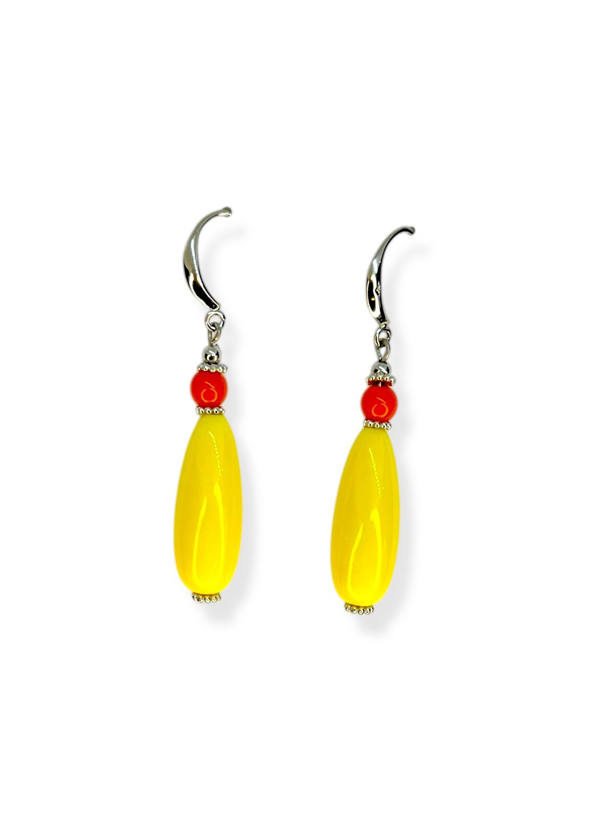 Brinco anzol niquel com bola coral de resina e gota amarela