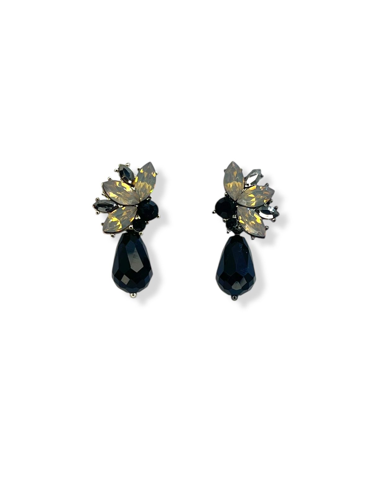 Brinco grafite de navetes bege e gota cristal preto
