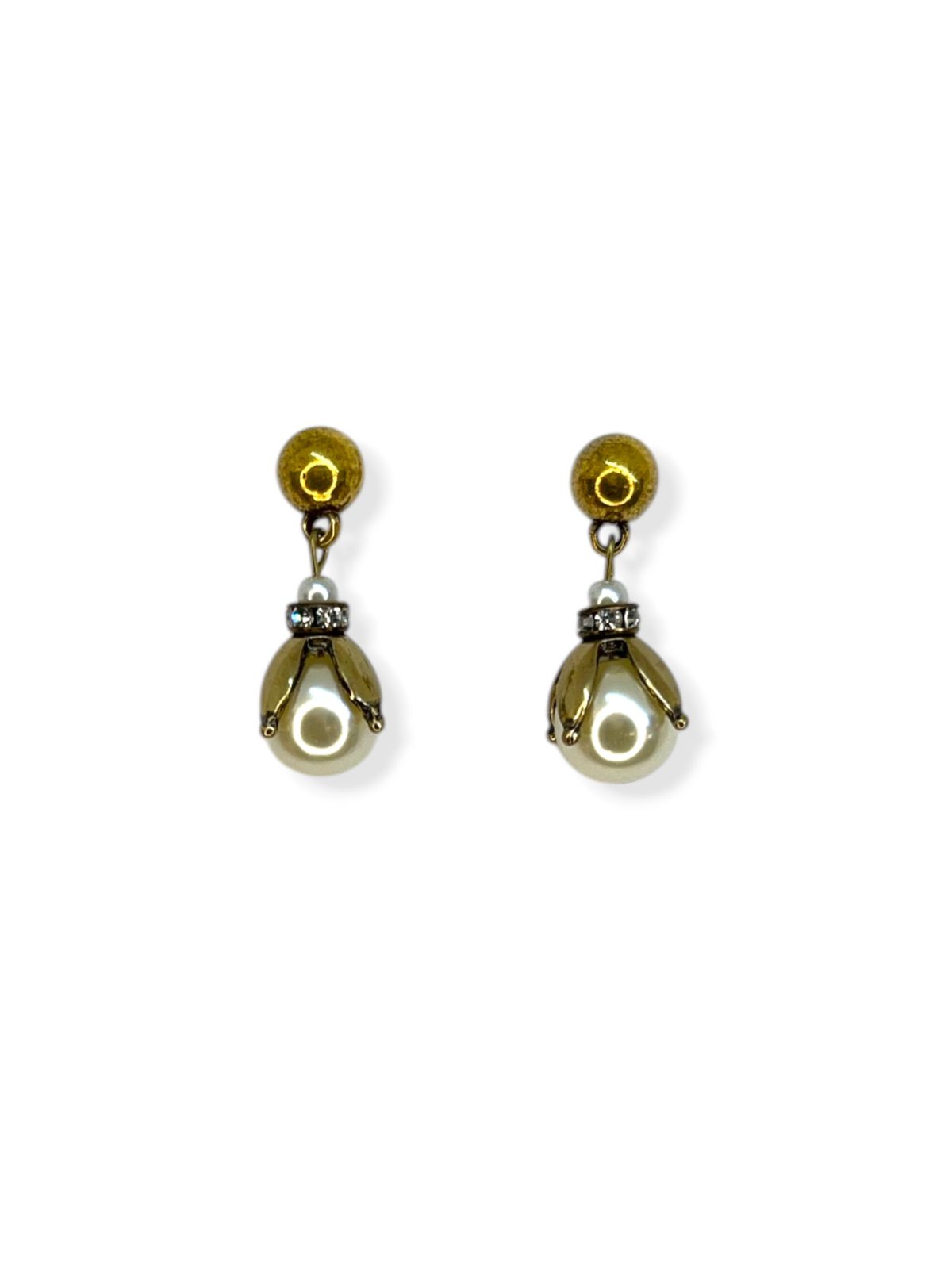 Brinco o. velho com pérola, tulipa estilizada e entremeio de strass