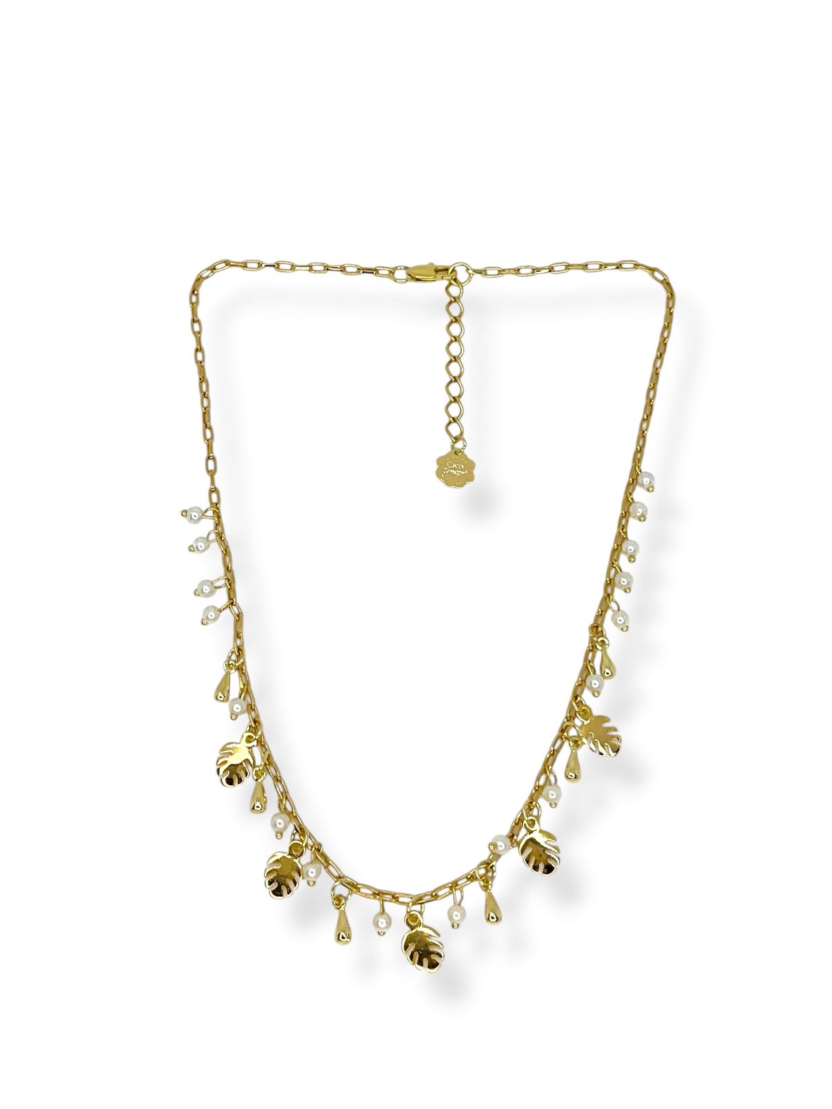 Colar 1v. corr. dourada com perolinhas e ping. folha