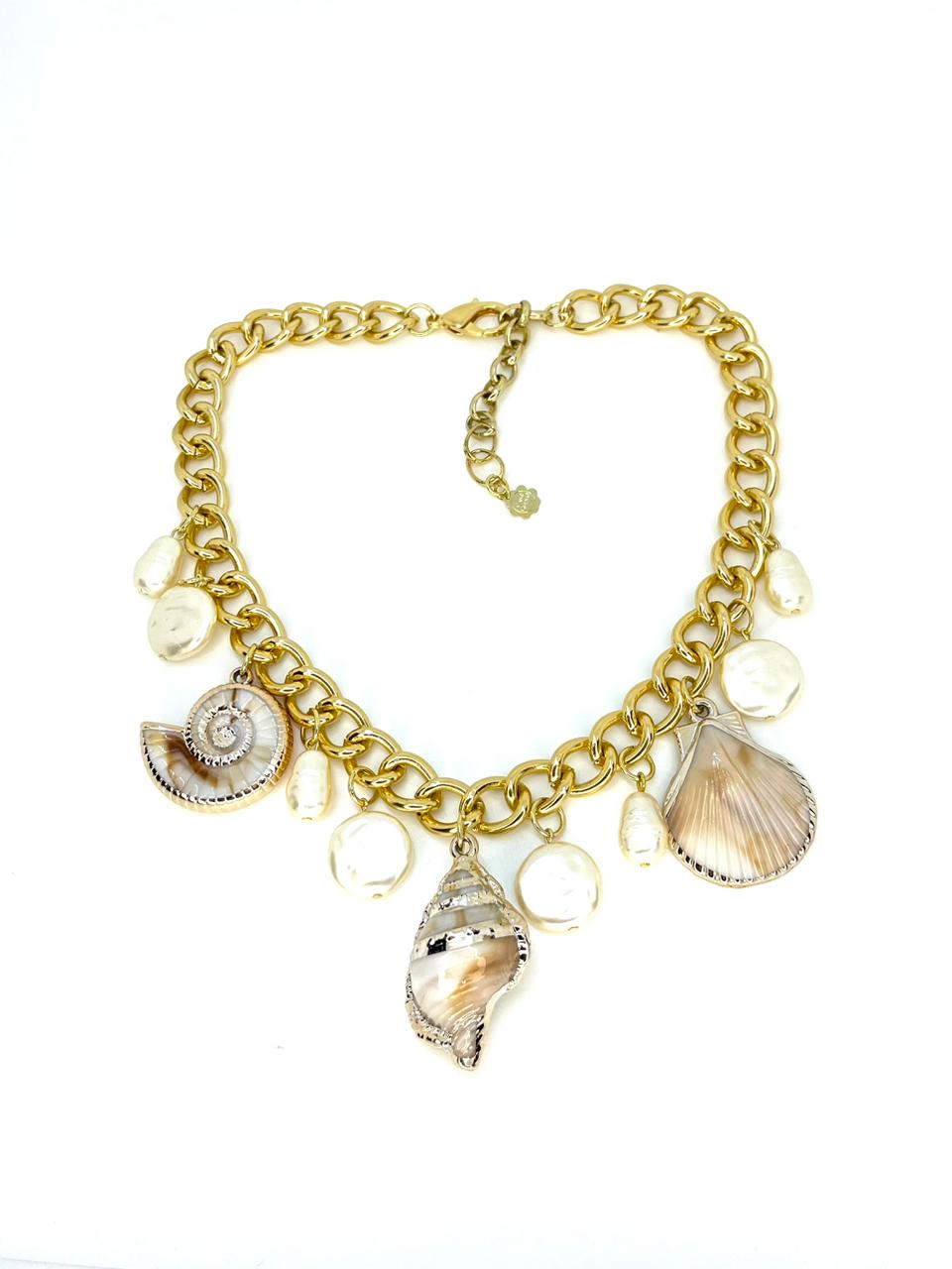 Colar 1v. corr. dourada com pingentes ostra, caramijo e pérolas