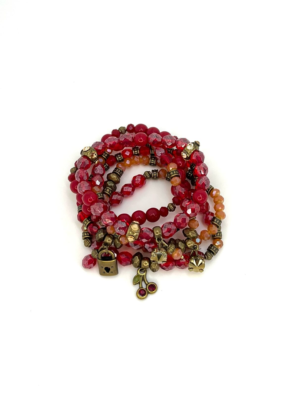 Pulseira 6v. de cristais vermelhos, salmão e abs o. velho